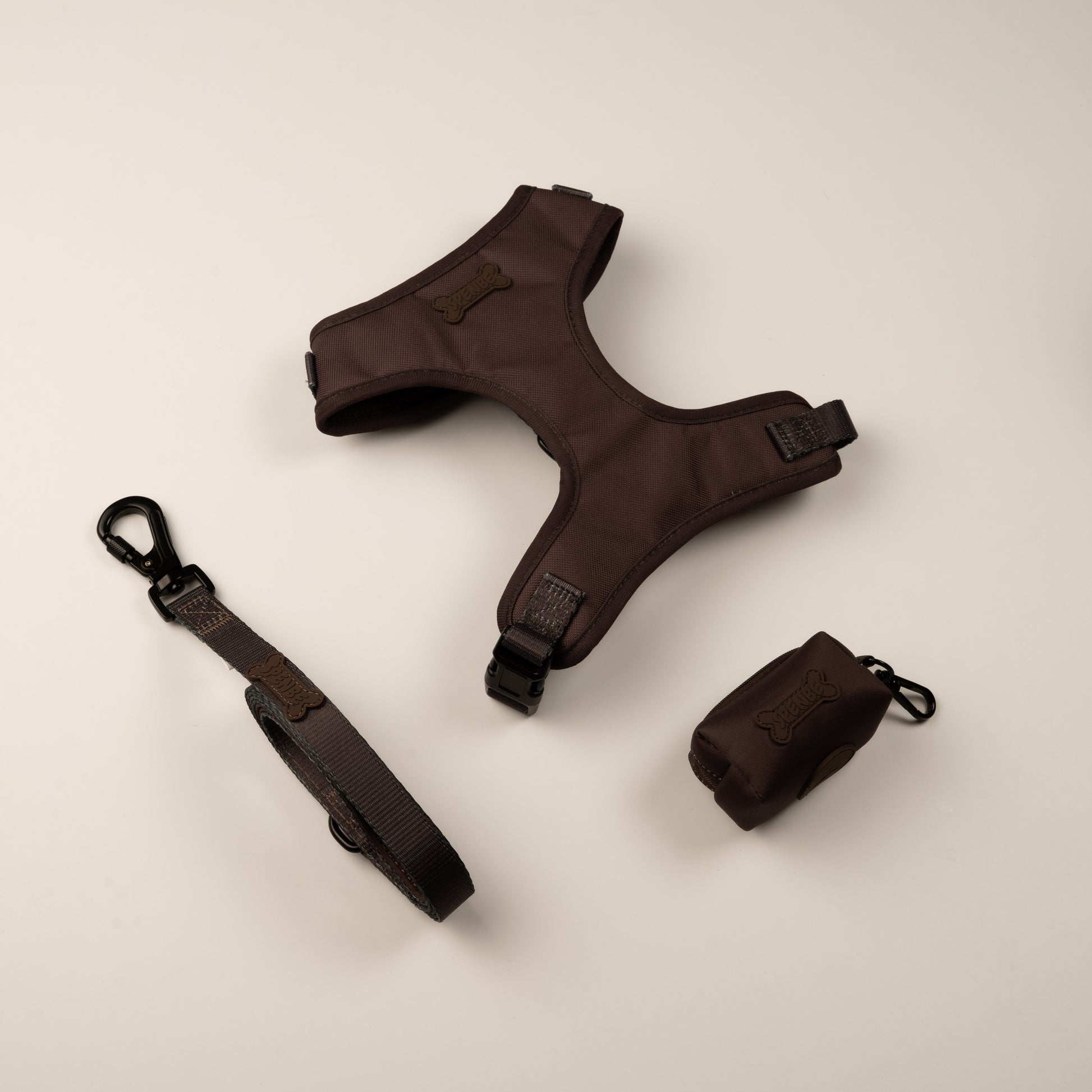El Set Trendy COCOA incluye nuestro arnés ajustable, correa y porta bolsas a juego, en un tono marrón profundo y atemporal.